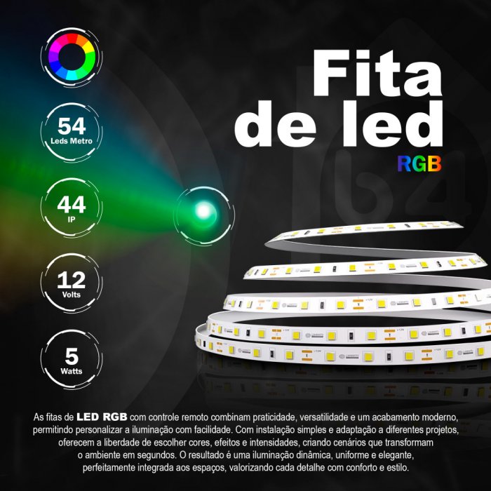 FITA 64 LEDS RGB 5050 12V IP44 5W 10MM R 5 M (KV) ( COM FONTE)