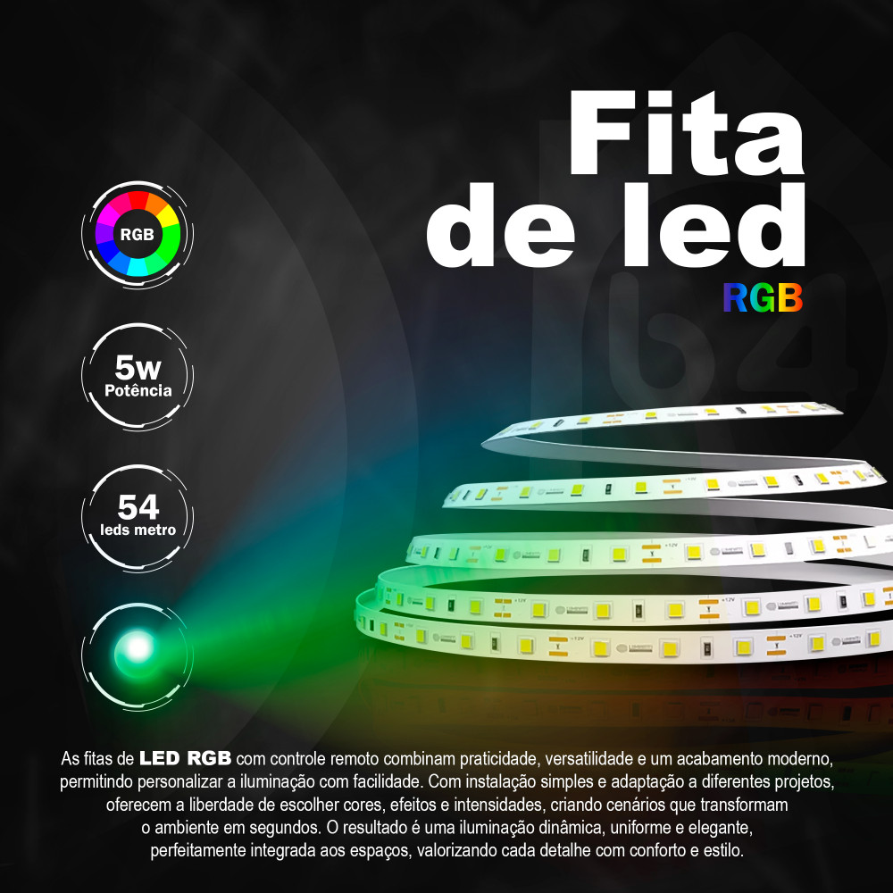 Fita RGB 54 Leds 5050 12v IP44 5w 10mm Rolo 5m (Kv)