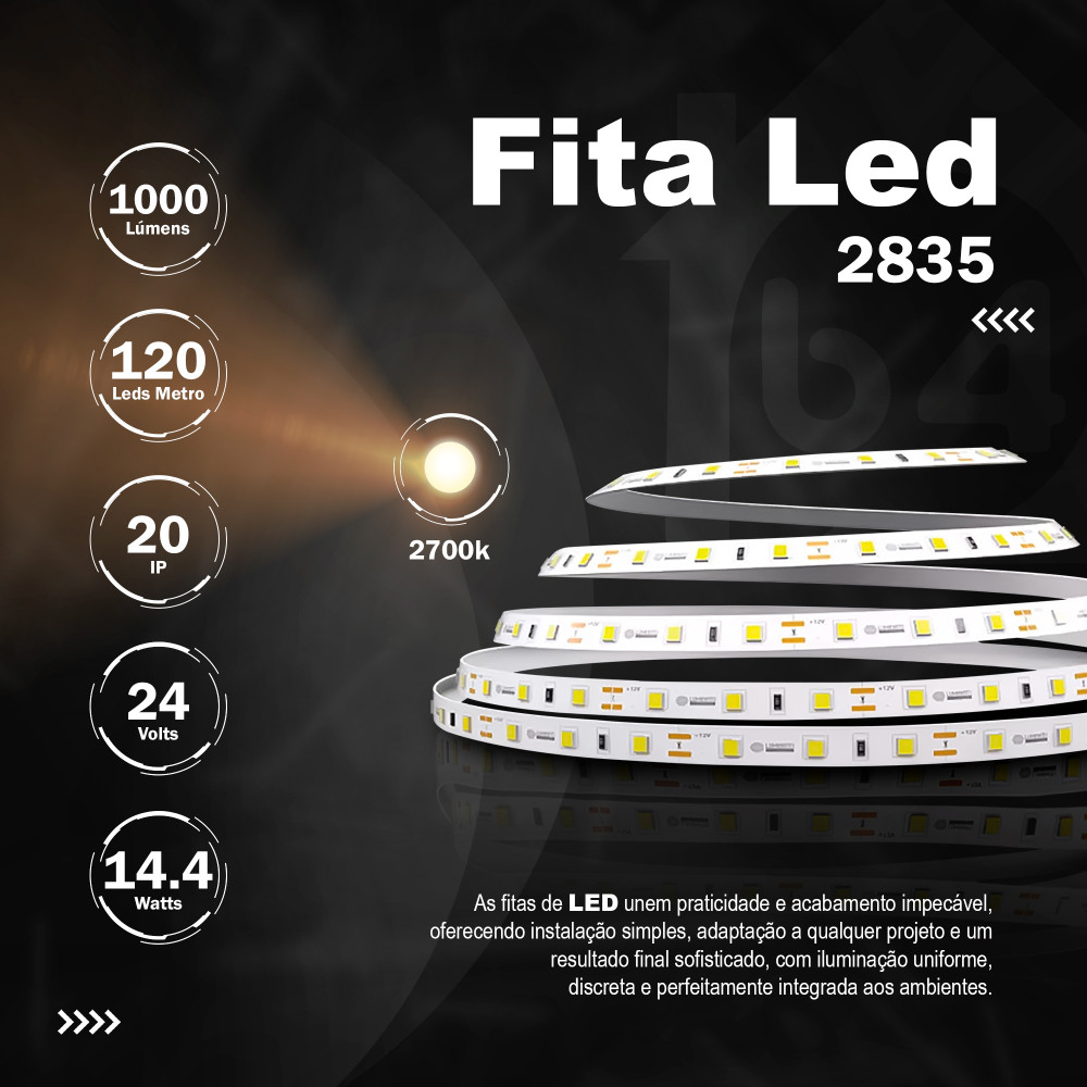 Fita 120 Leds  IP20 8mm 2700k<br>24v 14.4w 1000Lu R 5m.
