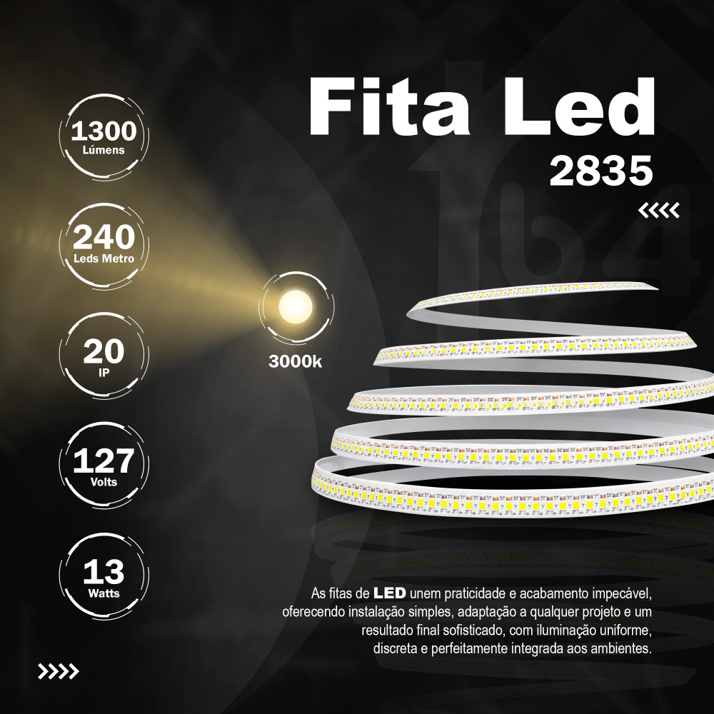 Fita 240 Leds IP20 11mm 3000k<br>127v 13w 1300Lu R 5m.